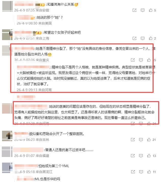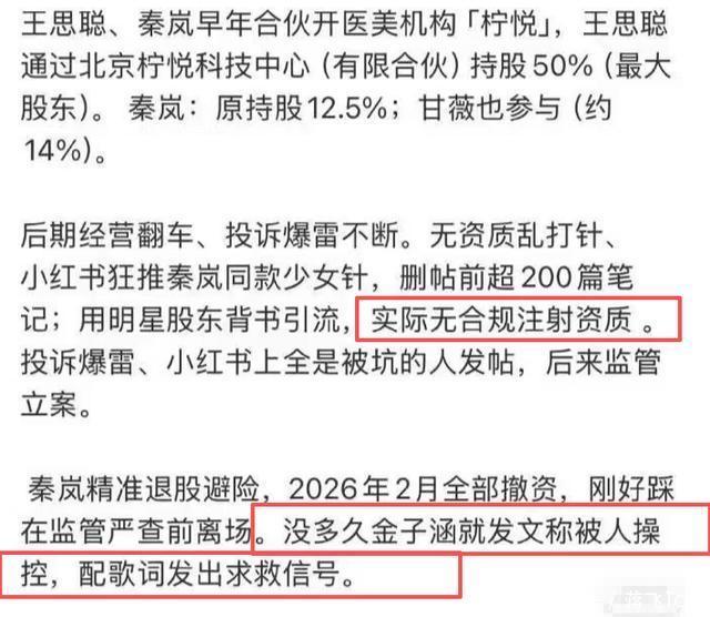 在艺人动态里公开表示要拉黑一个艺人不是小事,往往代表着背后的公司啥的也不来往了,对立了,而金子涵和蔡徐坤之间也没有啥交集, 所以在拉黑之后,网友一度怀疑金子涵是不是哪里有问题?结果好像还真有问题。 在3月初的时候,金子涵就有在社交平台上发文控诉,表示一直有什么人在控制自己,听着就挺玄乎的, 这件事很快就在一小部分平台爆料了出来,但很快就遭到了平台删除。 结果就在4月份的时候,相隔了有一个月左右的时间,金子涵就发文公开表示,再逼迫我就把真相说出来, 然后就表示她自己快被逼疯了,一直都被操控干自己不愿意的事,如今已经抑郁了,这一出看的不少网友心疼,也把不少网友给看楞了, 在当天,她在直播的时候晒出了自己的手臂伤痕照,并且发长文控诉,表示自己在2023年左右, 去美容院的时候,脸上打了足足四五十针的玩意,然后就被美容公司操控了, 这一出简直绝了,因为太玄乎了,听着就像是什么未来科技一样,或者就是用了冰一样的脏东西,且在说的情况下,这位前艺人精神状态堪忧, 事后还自曝说自己的手机也被监控了,而家人也不信她的那一套,不觉得她是被操纵了之类的。 而这个医疗公司,也就是王思聪前些日子,和秦岚合作的医疗公司,如果从她的口中来说出来是真的, 那王思聪秦岚这个合作的公司,指不定是真的搞了“人体实验”,听着多少有点恐怖了, 而如此奇妙的事情,自然也让阴谋论水涨船高,表示王思聪家大业大,即便是打电话叫了帽子叔叔也没用, 但也有网友反而感觉这是有了显然的被害妄想症的症状,不然怎么今天蔡徐坤,明天王思聪, 还有一部分觉得,她多多少少是精神分裂了,回想到以前的时候,她就给自己剃了光头,那时候的精神状态就已经很堪忧了, 这一点上,我们确实是要相信科学,如果真的有这么简单打针就能操控一个人的心智的事,那这件事有多大可能不被发现呢? 也有网友猜测,医美的问题多少是存在的,毕竟王思聪从办医美品牌的时候也才花了100万,听着就像是个空壳公司一样, 但更多的是她可能有点精神分裂,认为所有人都要害自己, 也是因为如此,热度慢慢下降,反而让阴谋论者更加怀疑是官方在控制事件发酵,这个思路也是绝了,真是如此,当初干嘛封王思聪的号。