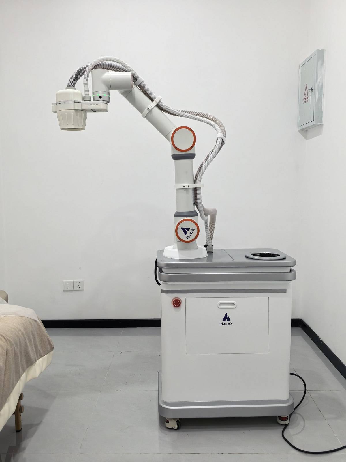 据武汉手智创新科技有限公司市场总监石子敬介绍,这款艾灸机器人最大的亮点在于自动穴位识别。记者观察到,在艾灸机器人的机械臂上有一个3D识别相机镜头,机械臂末端装有一个艾灸仓,里面放置艾灸条,下方有点火装置。“通过相机镜头再结合算法模型,它可以自动识别人身上的穴位,识别后机械臂会实现自动点火、自动施灸。”
